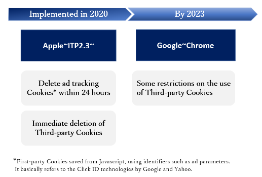 Recently, there has been a spotlight on the problem of data being collected and provided to third parties without consumers’ knowledge. And in response, Europe, California in the U.S., and Japan, have strengthened regulations on the use of third-party data by structuring laws regarding personal information. These laws protect users from the risk of their web behavior being passed on to third parties without their consent. - Proprietary regulations by the web browser and operating system providers, such as Apple.
