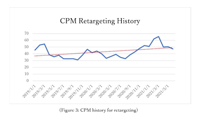 We have drawn our average CPMs for retargeting in display ads from January 2019 to June 2021 (Figure 3). As you can see, the approximate curve shows a gradual increase in CPM. The average CPM for June 2021 is about 140% compared to March 2020, the month when the full restriction of all Third-party Cookies began. These figures show that Third-party Cookie restrictions have an impact on ad distributions.