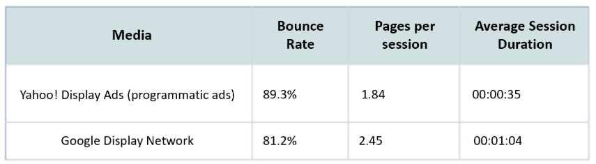 Here is an example of utilizing Google Analytics on Awareness Ads. One of our clients placed awareness ads on Yahoo! Display Ads (programmatic ads) and Google Display Network. The results on the management screen after one month were as follows.