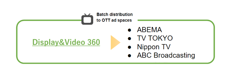 OTT (over-the-top) refers to video streaming services via the Internet, such as TVer. OTT ads are placed within those video contents and are expected to have high recognition due to their same characteristics as TV commercials, such as being viewed with sound and screen occupancy. Via DV 360, you can place ads on TVer and AbemaTV.