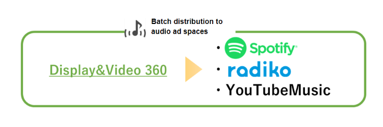 DV 360 also allows you to buy audio ad spaces. By distributing ads to music streaming services and Internet radio, you can reach out to people in their spare moments, such as when commuting to work. As of August 2020, DV 360 supports distribution to Spotify, radiko, and YouTube Music. By distributing audio ads via DV 360, you can integrally manage FQs*3 and measure listen-through CVs*4.