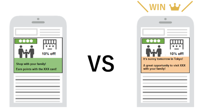 We have used weather-linked creatives to encourage customers to visit actual stores in the past. In one case, we used a still image creative that did not use weather signals, and in the other case, we used a weather-linked creative that involved regional and weather information signals. The weather-linked creative received approximately 16 times more clicks than the still-image creative. We believe that several reasons led to this result. These include real-time information attracting the users’ interest and people changing their attitude and going out to buy something after seeing the weather information. Based on the above, data-linked creatives that use signals have the effect of increasing ad performance.