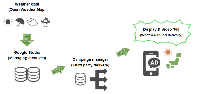 To distribute weather-linked creatives, weather data must first be imported into Google Studio3 from Open Weather Map.2 The weather data is then sent to Google Studio once an hour. Then, weather-linked creatives that match the delivery conditions are generated, and the Campaign Manager 3604 converts it into ad-tags.4 The purpose of the ad-tagging is to distribute the weather-linked creatives to different areas. Finally, the weather-linked ads are delivered according to the targets