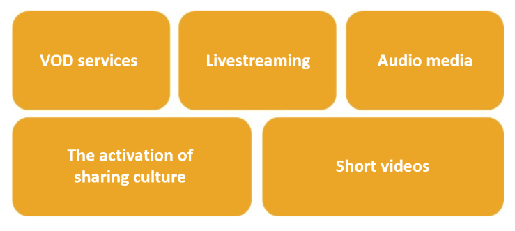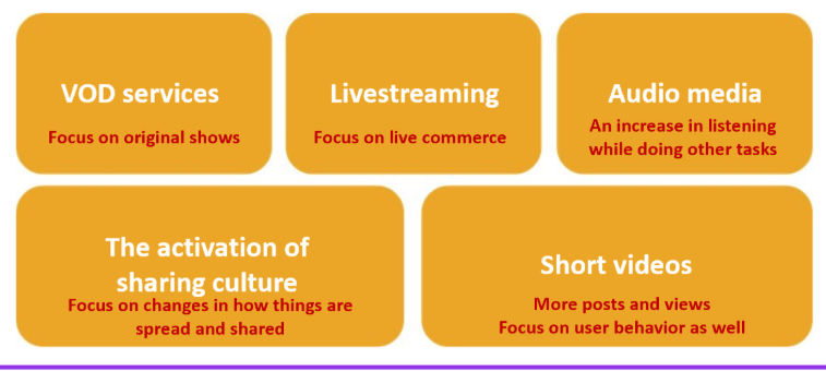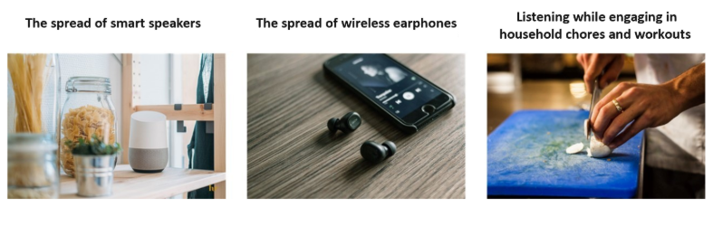 Third on our list is the increase in the use of audio media. This is thought to have been influenced by the spread of smart speakers, wireless earbuds, and listening engaging in household chores and workouts.
