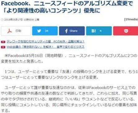 *Source: ITmedia, Inc. May 17, 2019. “Facebook Changes News Feed Algorithm to Prioritize More Relevant Content”