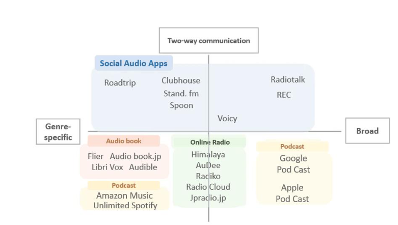 - Social audio apps: Services that allow not only companies, but also ordinary users to broadcast audio content. Characteristics include the availability of live broadcasting, collaborative broadcasting, as well as voice and chat communication among users.
