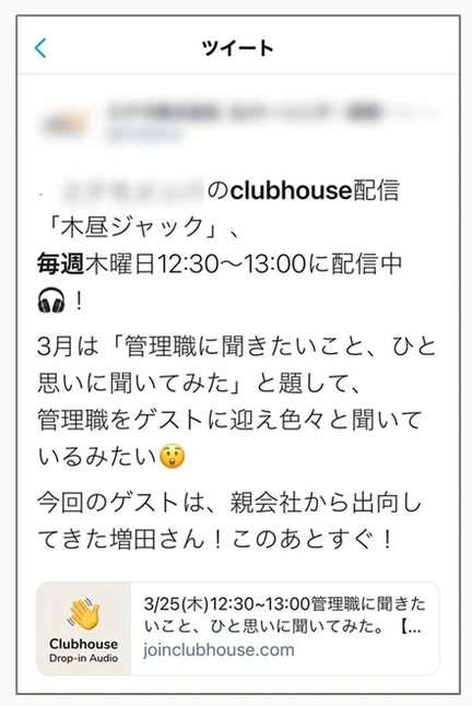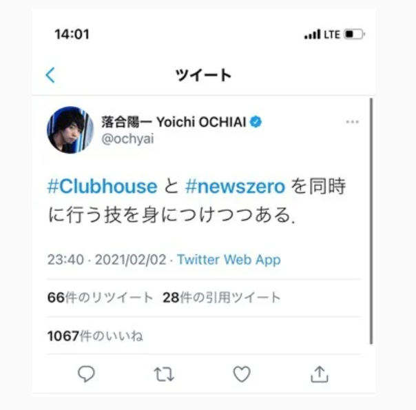 Yoichi Ochiai is a commentator on NewsZero, a program by Nippon Television Network. He talked about behind-the-scenes material in his own community titled “News ZERO room” while the show was on commercial break. He then returned to the show as the commercial break ended. After the show ended, other commentators gathered in Clubhouse and discussed the episode and talked about improvements for the next episode, as well as ways to fully utilize Clubhouse. By streaming on Clubhouse during the actual television show, viewers and listeners feel much more familiar with Ochiai, which in turn helps him and the show acquire fans, leading to higher ratings. Furthermore, since Clubhouse doesn’t produce archives of streams, listeners are enticed to tune in for information that can only be taken in at that specific point in time.