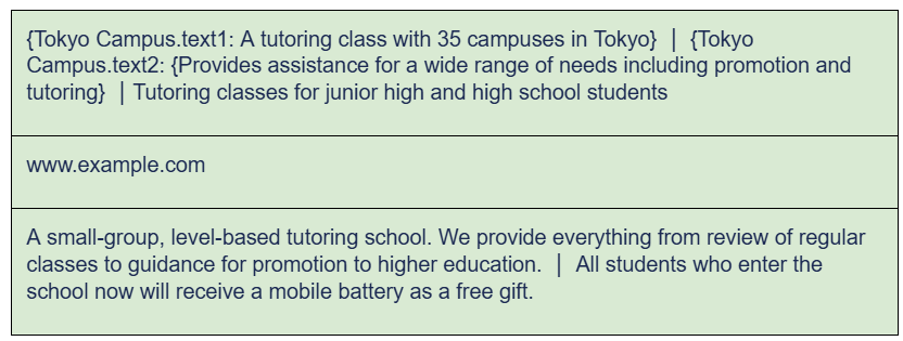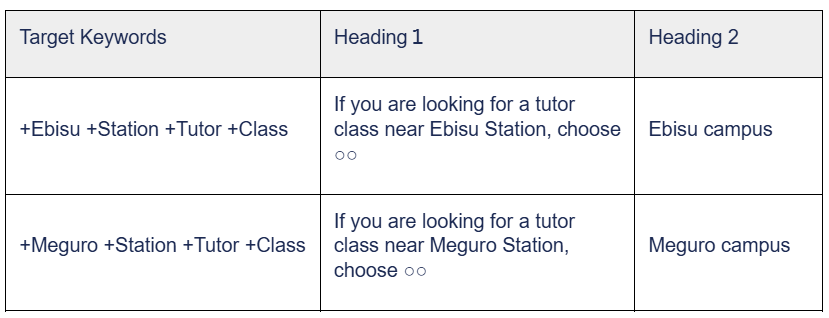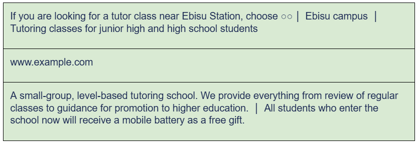 If a user searches for “Junior high tutoring class near Ebisu Station,” the text of this ad will change as follows according to the keyword “Ebisu Station tutoring class.” The way it works is that the contents of {Region. Text1} will refer to the target keywords +Ebisu, +Station, +Tutor, and +Class in the “Region” section of the ad customizer data file and insert “If you’re looking for a tutor class near Ebisu Station, choose ○○” entered on the same line in text1 and “Ebisu campus” entered in text2.