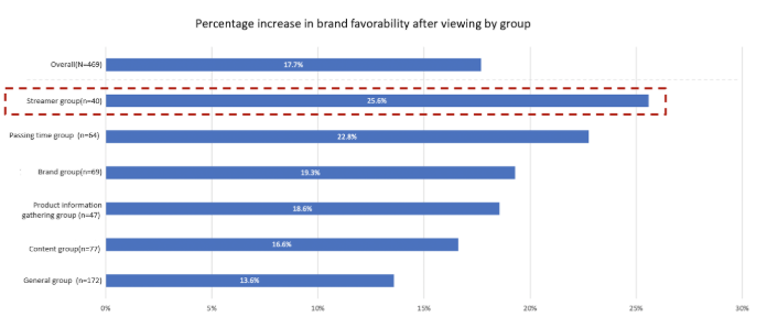 Now let’s look at how the attitude of viewers from each group changes after actually viewing live commerce shows, based on the changes after the most recent live commerce viewing. First, looking at the size of the increase in brand favorability after viewing live commerce (Figure 9), the streamer group shows a large increase from the overall value of 25.6%. The ability to interact with a store employee or influencer of one’s choice who introduces products may increase satisfaction and lead to an increase in favorability of the brand. This may be the effect that live commerce excels at achieving.