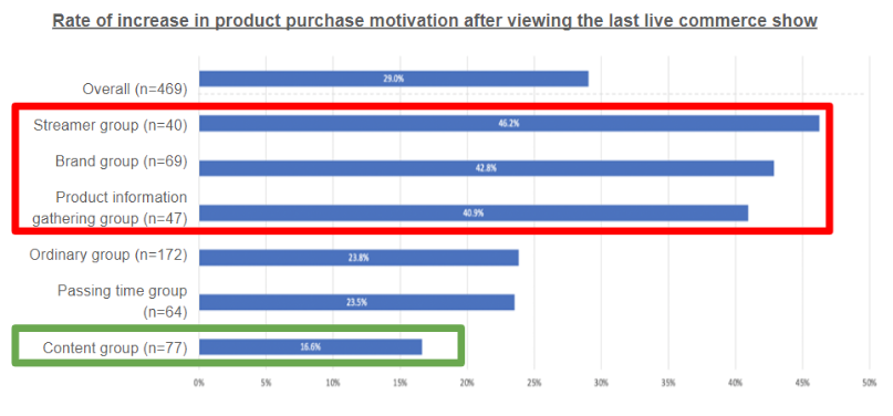 The top three are the streamer group, product information gathering group, and brand group, which also had high purchase motivation levels. Like before, at the bottom is the content group.