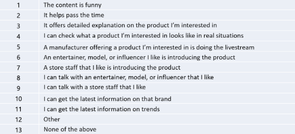 In understanding the overall experience, we found that viewers have different viewing objectives. Different viewing objectives may influence viewing attitudes and create differences in behaviors such as live engagement (likes and comments) and purchases, depending on the objective. Next, let’s take a deeper look at the viewer’s purpose for watching live commerce.