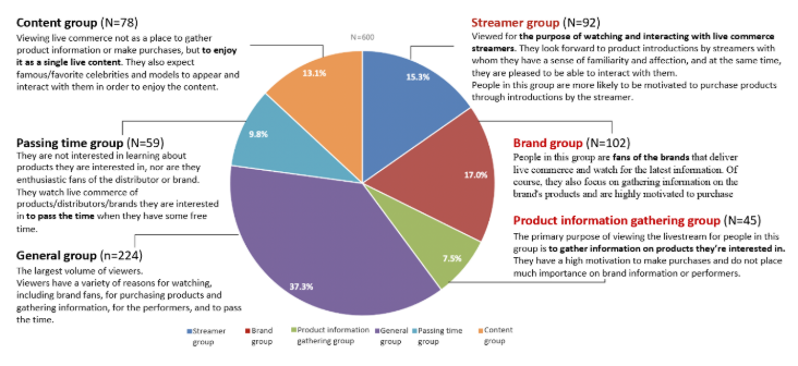 We found that among viewers, there are users with distinctive motivations, such as the streamer group, brand group, product information gathering group, content group, and passing time group.