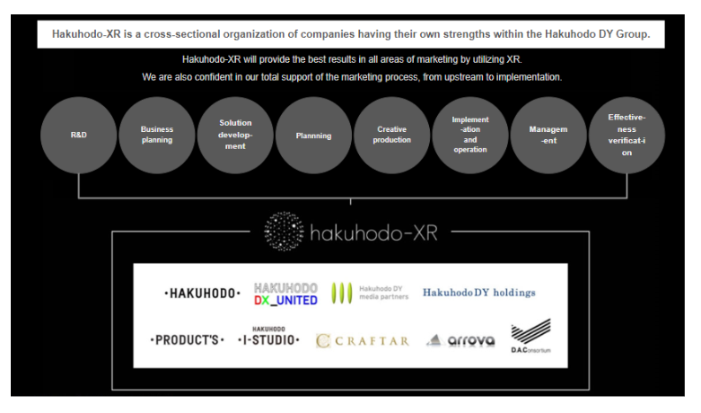 A cross-sectional organization of nine companies of the Hakuhodo DY group, providing total support from upstream to implementation (https://hakuhodo-xr.jp/)