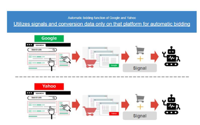 For example, the automatic bidding function of Google Ads combines data measured by Google Ads’ conversion tags when a user clicking on Google search ads enters a website with its signals (browser/device/region, etc.) to calculate the bidding price. This is the same with Yahoo! Ads.