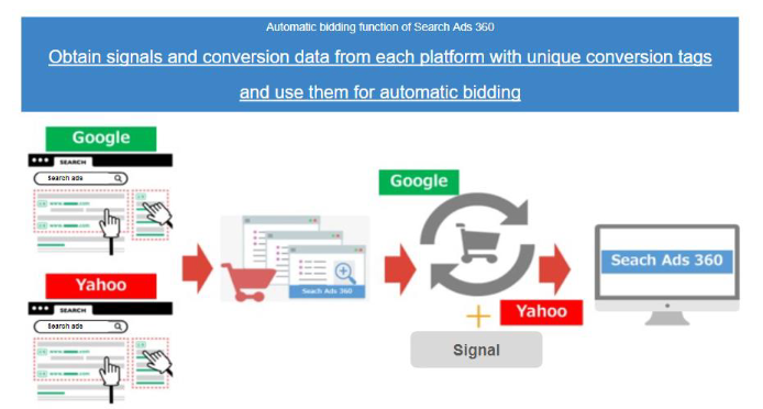 On the other hand, Search Ads 360 accumulates conversion data via Google Ads and Yahoo! Ads together by implementing its Floodlight conversion tag on a website. And the collected conversion data (including CVR) is utilized for its automatic bidding function. When SA360 automatically calculates the bidding price for Google Ads, it will take Yahoo! Ads’ conversion data into account. For Yahoo! Ads, vice versa.