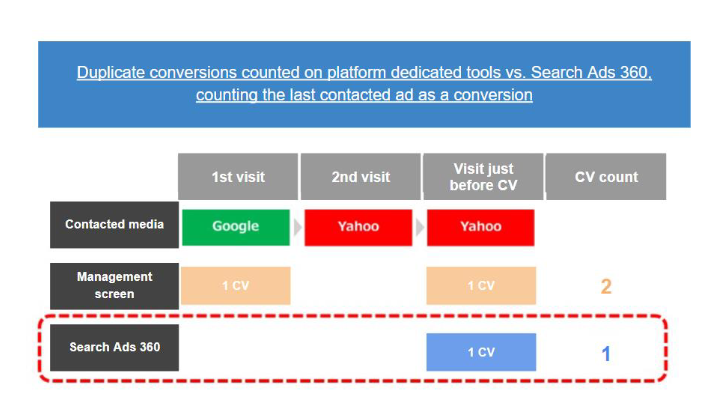 For example, let’s say a user clicks on a search ad via Google Ads, enters the website, and leaves. That user then clicks on a search ad via Yahoo! Ads, enters the website, leaves, and enters the website again via Yahoo! Ads. In that case, Google Ads recognizes the first visit as a conversion, and Yahoo! Ads recognizes the third visit as a conversion, resulting in duplicate conversion across the two platforms.