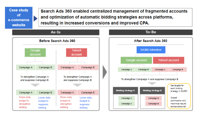 Now, I would like to run a case study from the e-commerce industry, which improved their results by implementing SA360 to centrally manage search ad accounts for Google and Yahoo! Ads and running automatic bidding with it.