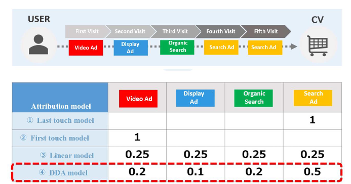 Using the DDA model assigns evaluations to each action in the conversion path, even across devices. Understanding the contribution of each ad result calculated from past data allows users to discover potential measures that the Last Touch Model missed.