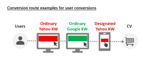 For example, assume that the three patterns shown above exist: Ordinary Yahoo keywords, ordinary Google keywords, and designated Yahoo keywords. With media measurements, the Yahoo! ad and Google ad are measured with separate media tags, so the conversion counts will overlap, causing bidding optimization to take place for each media.