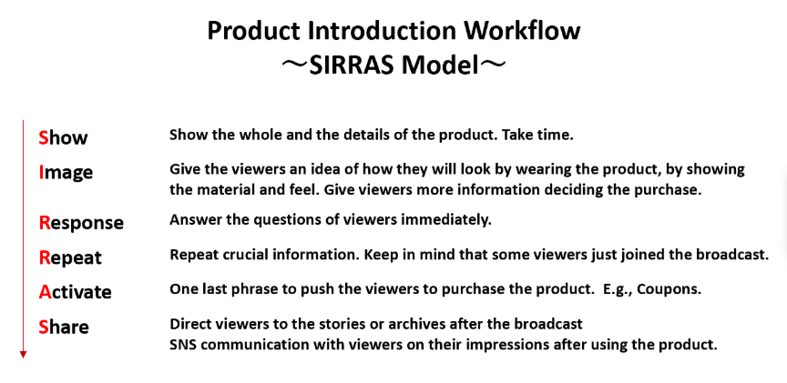 SIRRAS is an acronym for “Show,” “Image,” “Response,” “Repeat,” “Activate,” and “Share,” a chronological framework for enhancing interactive communication from the beginning to end. You can structure your live commerce by speaking with this order. Yukos, a leading expert in live commerce, also incorporates these points into her live commerce. Let me explain each step one by one.