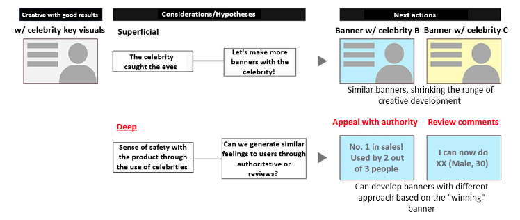 It is usually due to the superficial consideration of the results. For example, if a banner featuring a celebrity gets good results, superficial insight will end up to the action of “mass-producing banners featuring the celebrity”. If we look deeper into the reasons why it earned good results, we can think that “the sense of safety (i.e., authority) of the product by using a well-known celebrity led to the results”. In such a case, next actions can have range of options including “expansion of the maximum level of expression to communicate safety, such as being No. 1”. Keep asking “Why?” is the key for having different options in the next step.