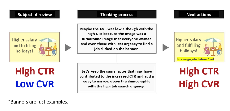 Example 1Various creatives were distributed in a project of advertiser in the human resources industry. The CTR of a banner that showed “fulfilling private life to communicate the positive turnaround after changing jobs” was extremely high and thus the distribution volume was also high. However, the CVR via that banner was low, and the CPA for the entire ad group was rising.