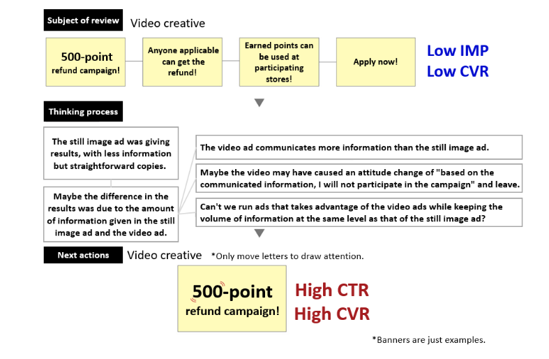 Example 2In the “Point Refund Campaign”, the advertiser conducted display distribution covering videos and still images. The video creative did not lead to overall acquisition and distributions did not increase.