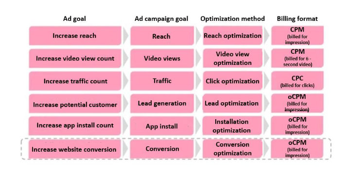 In TikTok, the type of billing is determined by the goal. For example, if your goal is to increase conversions on your website, you will be charged by oCPM.