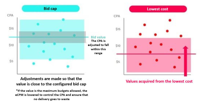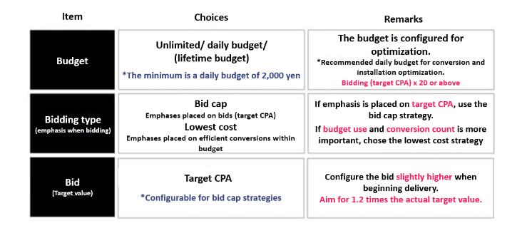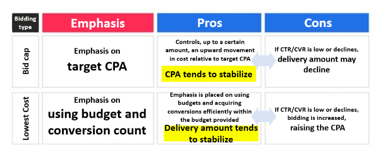 There are two types of bidding types: Bid cap and lowest cost. The benefits of the bid cap include the stabilization of CPA. However, if the CTR/CVR is low or declines, ad delivery may decrease, making it difficult to control the budget. Lowest cost prioritizes budget use and enables stable ad delivery. However, if CTR/CVR is low or declines, the CPA may increase.